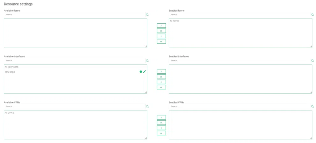 In this tab, you may add and delete resources such as farms, interfaces (virtual interfaces) and VPNs.
