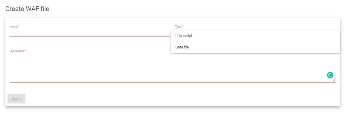File content. Enter here a given content file in the format selected previously to create that specific file. At the creation time, the system will check internally if the file’s content is related to the file type previously selected in the WAF rule.