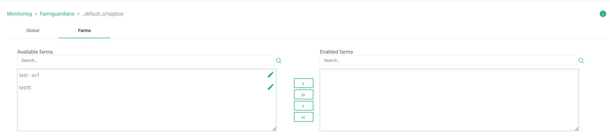 Farms and services can be assigned or removed from this Farmguardian health check using multiple selections with single arrow icons or double arrows to enable or disable all farms.