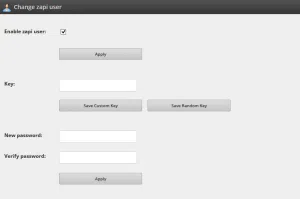 Once zapi user is enabled, it’s necessary to set a key (custom or random key) and a password. These parameters are required to use the ZAPI.