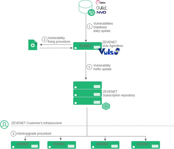 1 – Daily, a check process is launched, downloading the known vulnerabilities from the databases already mentioned (Debian, OVAL, and NVD).