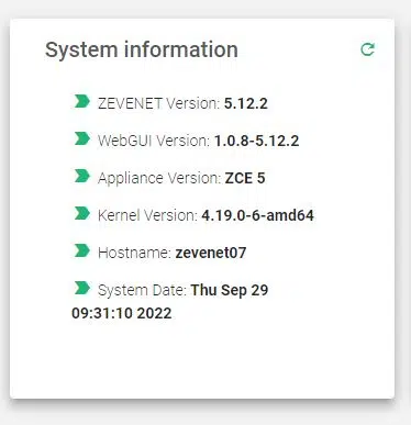 Basic information related to the appliance: ZEVENET Version, Appliance version and hypervisor, kernel version, hostname, and system date.