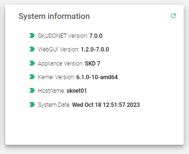 Provides basic information about the load balancer, such as the Skudonet version, appliance version and hypervisor, kernel version, hostname, and system date.