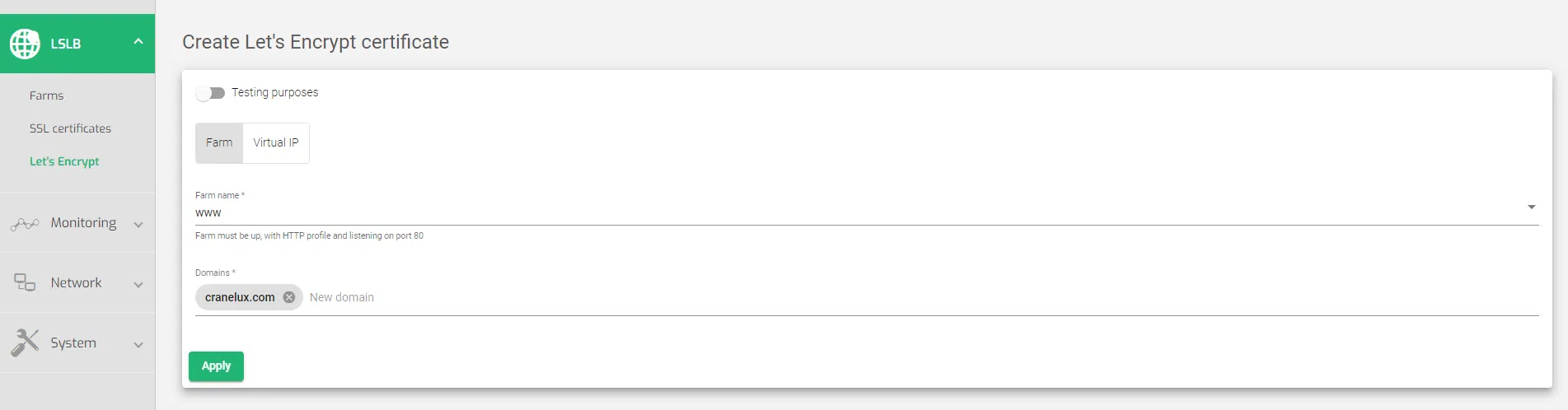 - Go to LSLB > Let’s Encrypt > Create certificate section.
