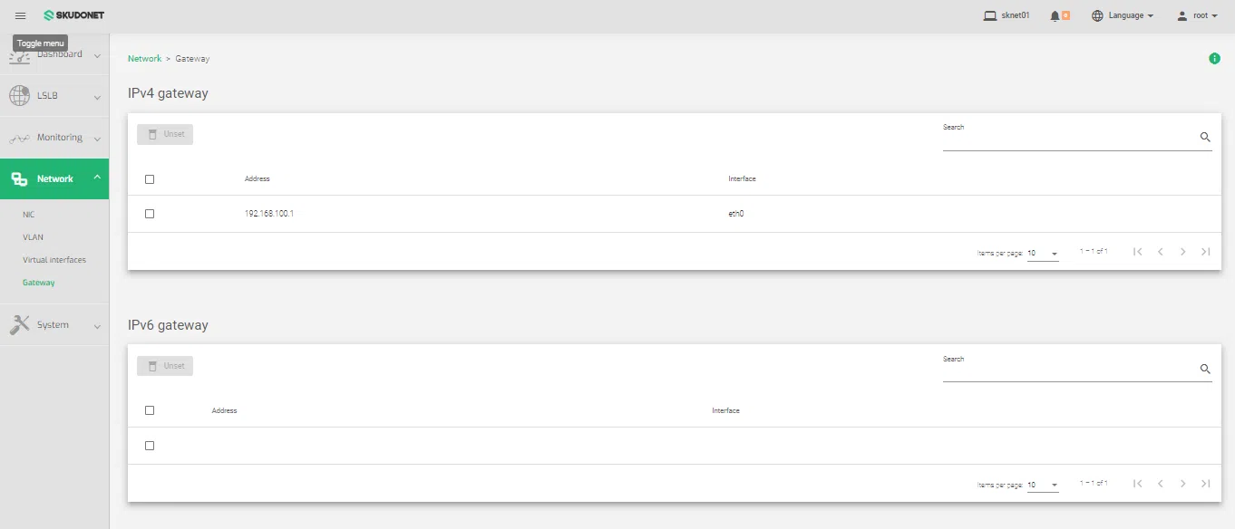 A default gateway is a router that devices on a local area network (LAN) use to access the internet. In SKUDONET ADC, you can configure a default gateway for both IPv4 and IPv6 in the global routing table.