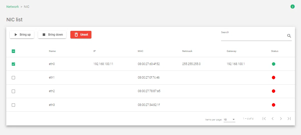- Edit:Change the NIC configurations, such as the IP address, netmask, and gateway. One may only use the edit Icon after hovering over the Interface you’d like to edit. A pencil Icon will show.