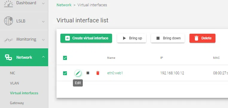 • Edit: Changes the configuration of a selected virtual interface.