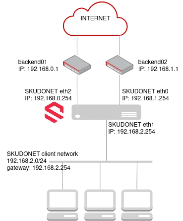 • SKUDONET requires to be configured in each network where the local IP of the internet provider is present (eth0 and eth2)
