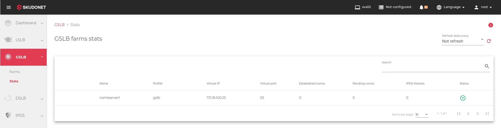 By default, the stats table shows static data for the connections of each GSLB farm. However, you can set the table to auto-refresh every 10, 30, 60, or 120 seconds.