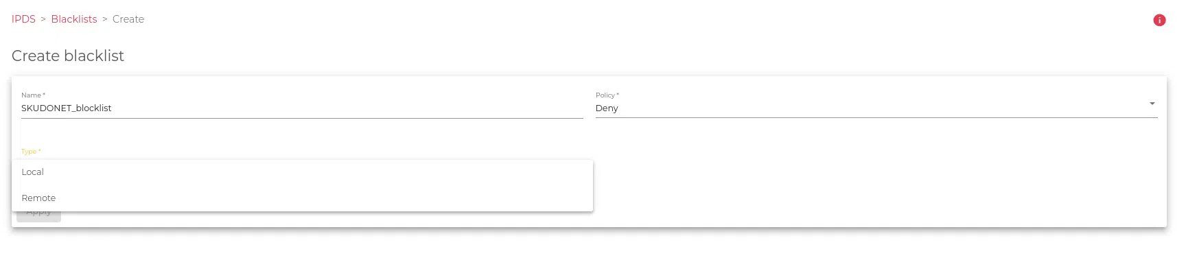 - Type: Choose whether to enter the list local or import from a remote repository. For local type, the sysadmin has to introduce the list of IPs or networks manually (CIDR format supported). For Remote, the list needs to be accessible through HTTP or HTTPS protocol, please enter the full URL. The type of policy can’t be changed once the Blocklist is created.
