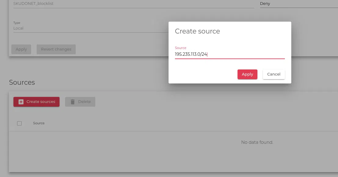 In the Sources section, you can enter the IP addresses or subnets that you want to allow or deny access to. You can enter individual IP addresses or subnets, or you can use wildcards.