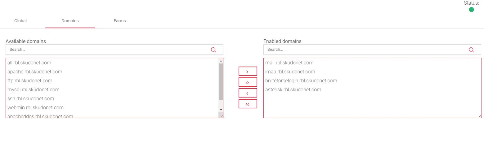 The Available Domains list contains the domains that can be used for RBL rules. Domains can be enabled or disabled by moving them between the Available Domains and Enabled Domains lists using the single or double arrow buttons.