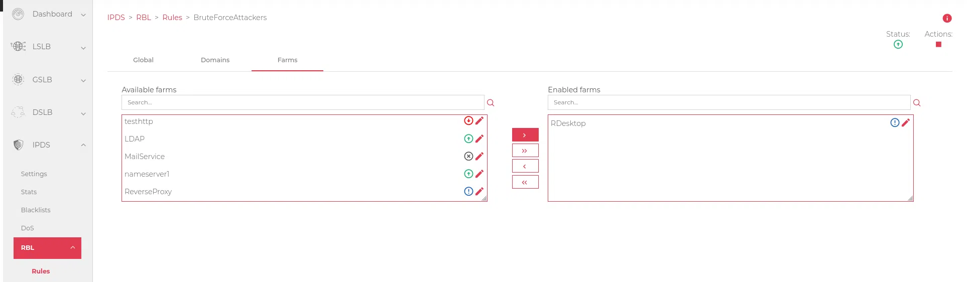 The Farms list contains the farms that can be used with RBL rules. You can add or remove farms from this list using the arrow buttons, or by dragging and dropping them from one table to the other.