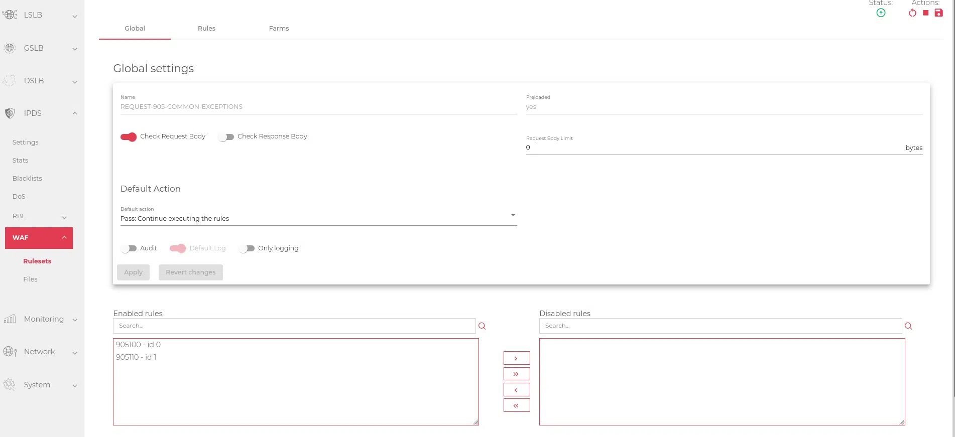 To enable or disable WAF rules on a Farm, Drag and Drop them from the Available farms to the Enabled farm box or vice-versa.