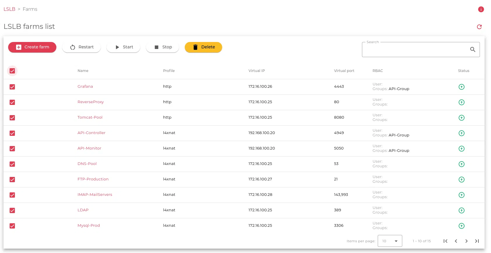 When the status shows green, it means the farm is running and it will manage the traffic in the configured virtual IP(s) and PORT(s). But if it is red, the farm will stop accepting any incoming connection. If the status turns yellow, it means the farm has accepted changes but hasn’t applied them yet. A restart may be needed to apply these changes.