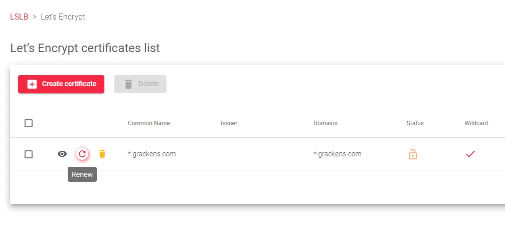 - If you do not see any Status change for this wildcard cert in the Let’s Encrypt certificates list, hover over the domain you’d like to generate the certificate and click the Renew button.