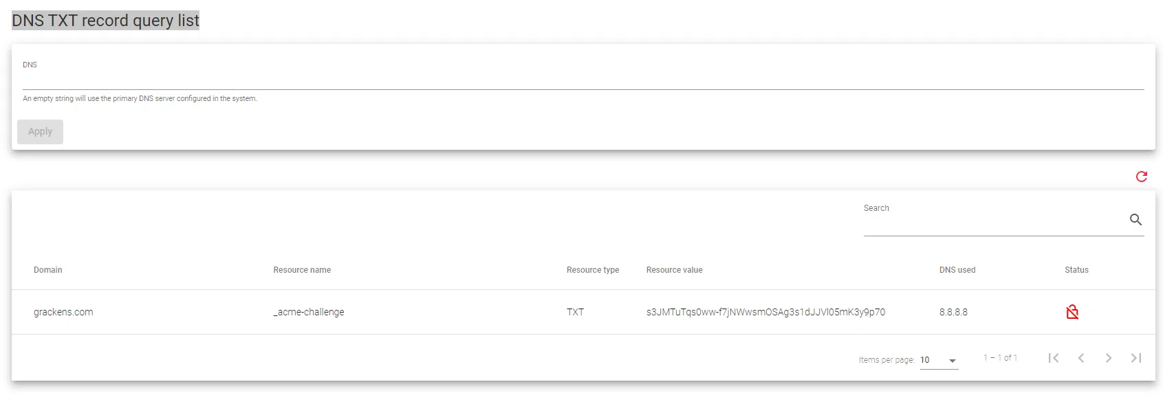 - To view the TXT record, hover over the domain whose TLS/SSL cert you’d like to generate and click the Eye Icon labelled Check DNS TXT Records, you will see a DNS TXT record query list.