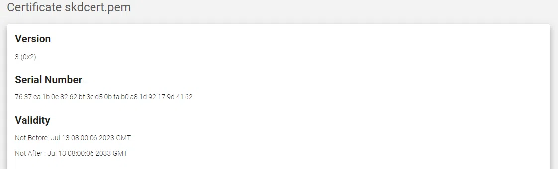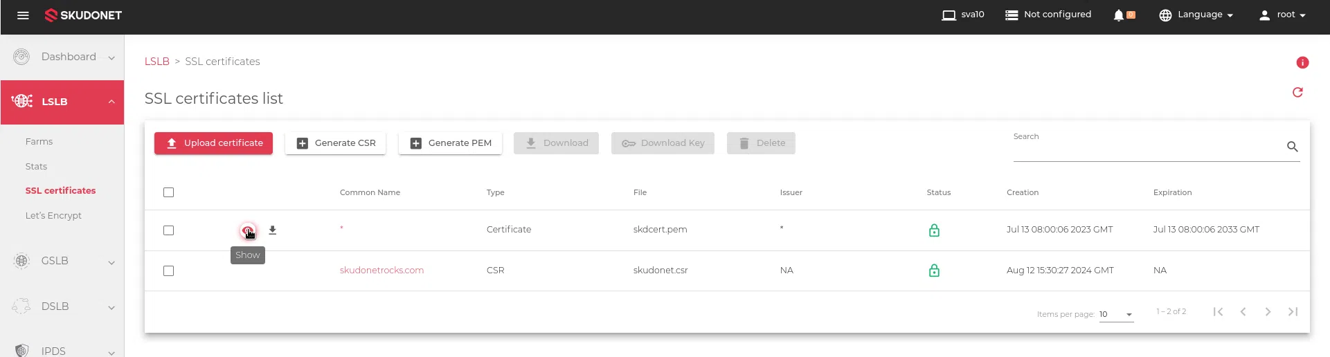 This section is about viewing SSL certificate information. When you click on a domain name in the Common Name column or the Show icon, the certificate’s details will appear.