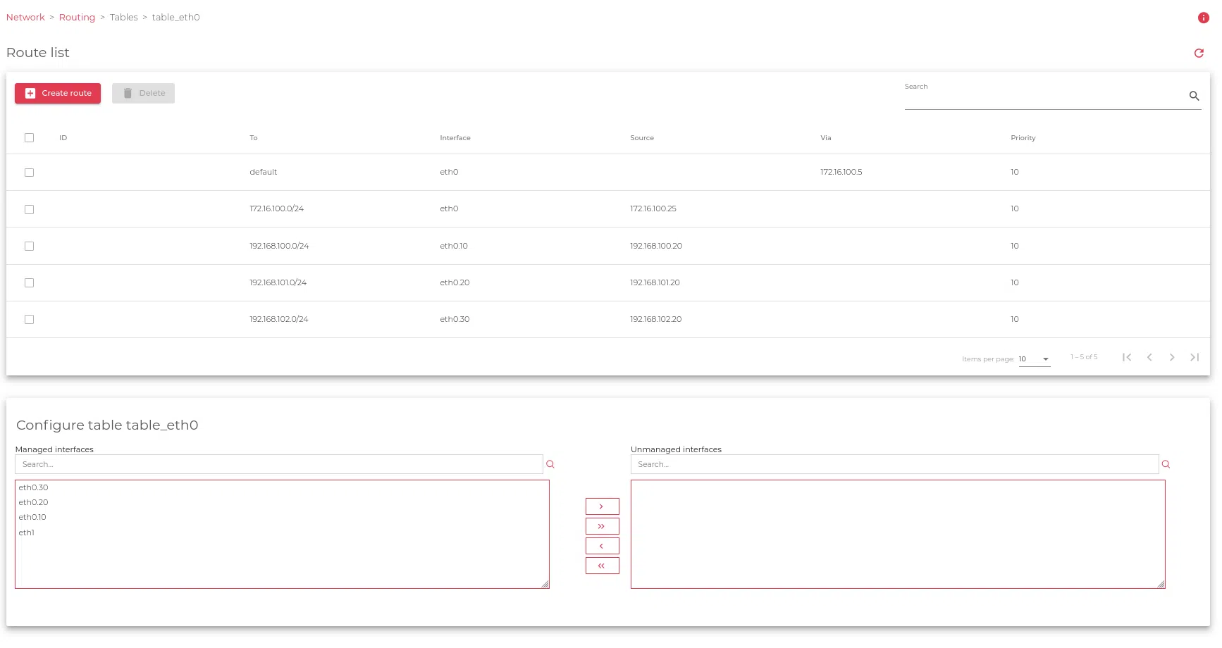 Each routing table can use any local network interface to reach a certain destination, in case you need to misconfigure a certain Network interface of a certain routing table please move the network card to the Unmanaged Interface section.