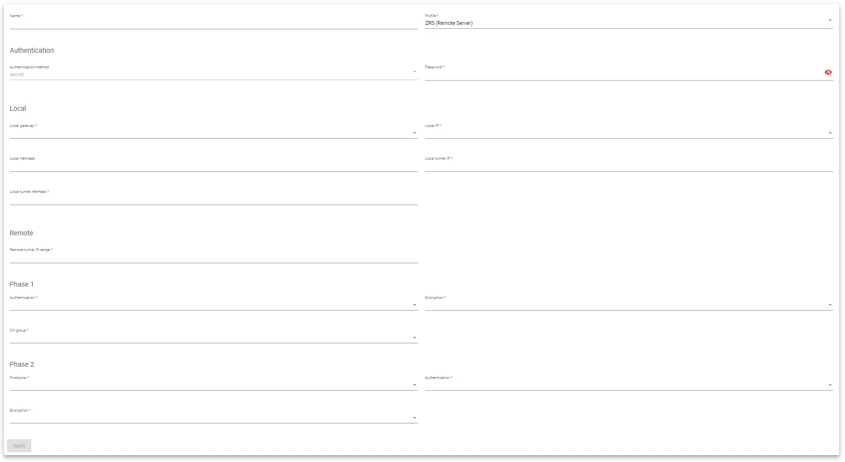 - Authentication: Choose the authentication method for IKE Phase 1 negotiations.