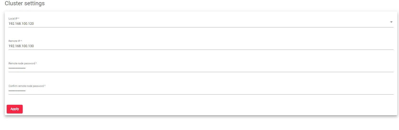 Local IP: Choose the network interface that will be used for managing the cluster. This interface cannot be a virtual interface.- Remote IP: Enter the IP address of the node that will be the backup node.