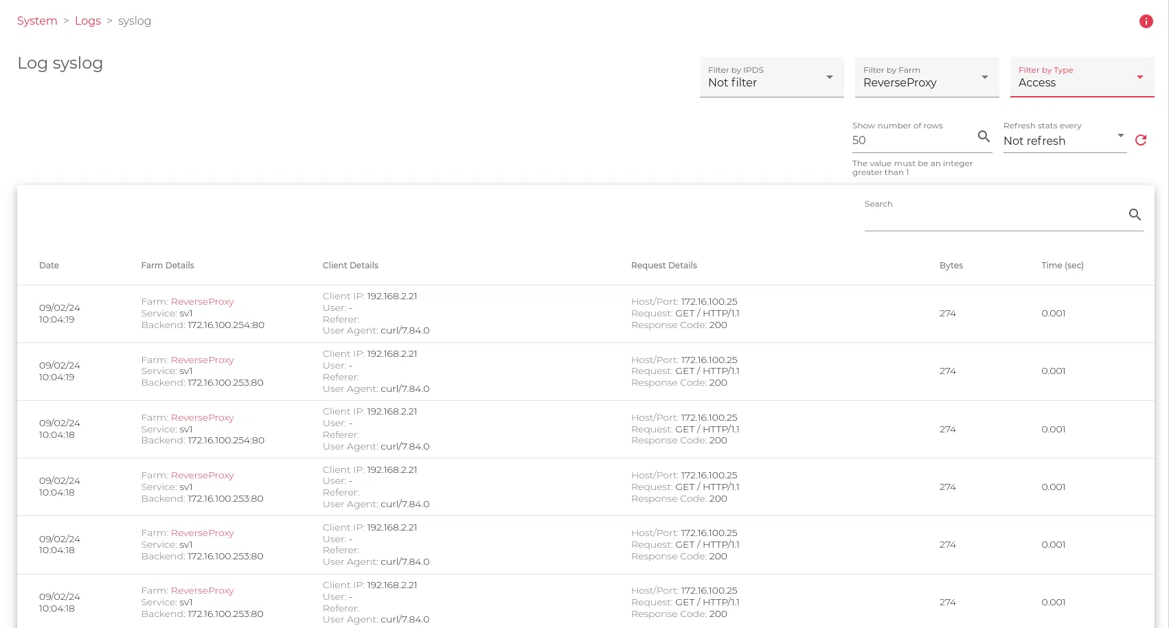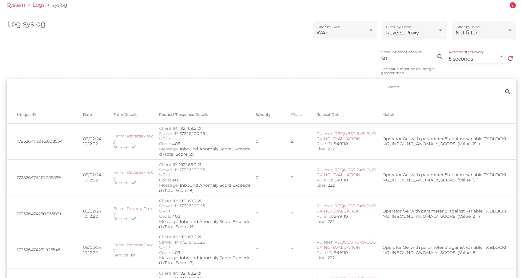 The previous filter shows all the WAF events found in the farm ReverseProxy, ordered by columns. (Filter by IPDS = WAF, Filter by Farm = ReverseProxy, update every 5 seconds)