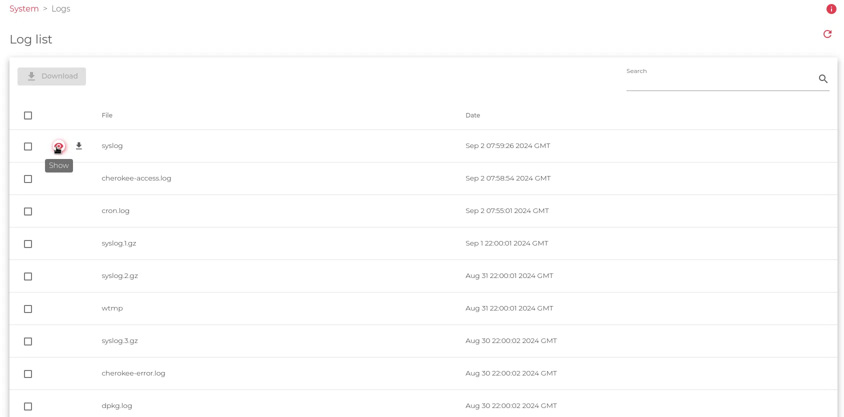The Show action opens a new screen for managing the log file display. In this section, you may select the desired number of files to show, starting with the latest entries. One may also utilize the search filter to refine the log content and narrow down his search.