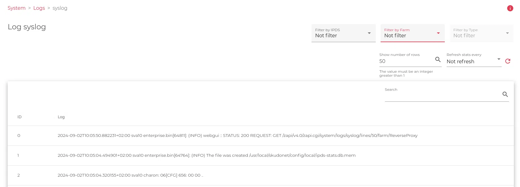 - Filter by IPDS: This view filters IPDS events in the log, those events are related to the different security modules inside IPDS, like Blocklist, DoS, RBL and WAF. SKUDONET v10 includes log formatting for WAF making the information more readable.