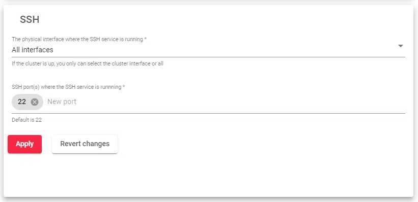 • The physical interface where the SSH service is running: The SSH service is bound to a physical interface, such as an Ethernet interface. Virtual and floating interfaces are not recommended, as they may not be accessible remotely.