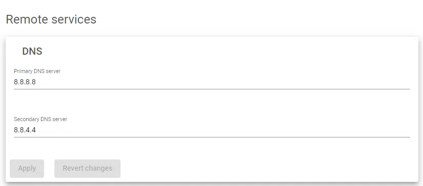This section manages external services that the load balancer needs, such as DNS for resolving network names, NTP for synchronizing the system clock, and a Proxy service for using an external proxy for internal services. Any changes made to this section must be applied by clicking the Apply button. The Revert Changes button can be used to discard any modifications and revert to the previous configuration.