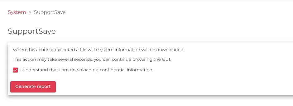 The SKUDONET SupportSave feature allows users to create a configuration and status snapshot of their load balancer node’s current state. This snapshot includes all of the information that the SKUDONET team needs to troubleshoot any problems that may occur, such as logs, configuration, and system status.