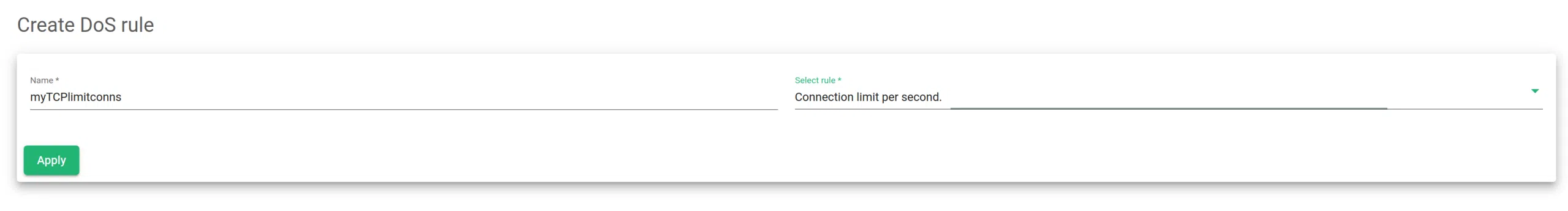Rule. Type of the DoS rule to be created among the available types, it will define what will be the rule focus: Connection limit per second, Total connections limit per source IP, Check bogus TCP flags, Limit RST request per second.