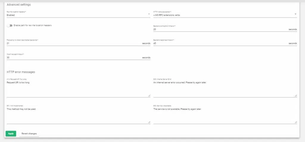 Rewrite Location headers. If enabled, the service is forced to modify the Location and Content-location headers in response to the clients. If they have the value of the backend itself or the VIP (but with a different protocol) the response will be modified to show the virtual host in the request. If the toggle button enabled and compare backends is enabled, then only the backend IP address is compared. This is essential when redirecting requests to an HTTPS listener on the same server as the HTTP listener. When enable and compare backends is selected, a flag called Enable path for Rewrite location Headers will be available. Enable this flag if you are working with Rewrite URLs. This value will force you to check the URL responses and will change the response to the original if a rule is configured in Rewrite URLs. If this field is enabled, it will override the same directive in the global section.