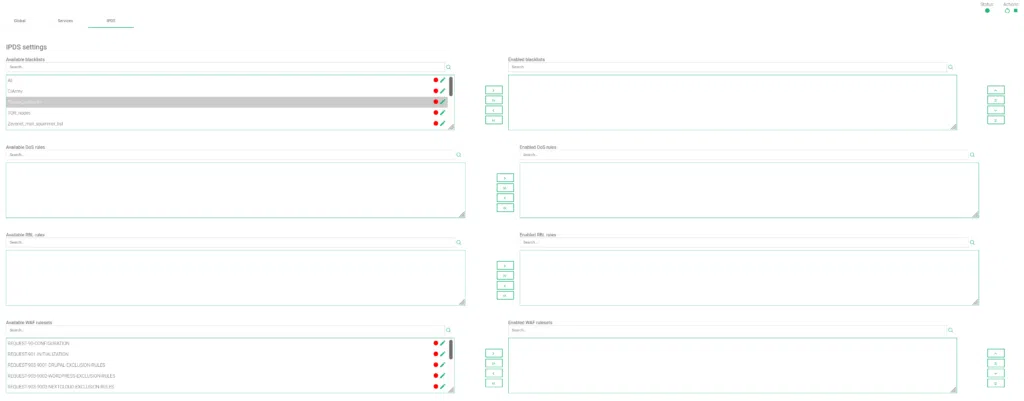 This section let you enable IPDS rules. The list shows different types of protection and a select box to enable them. For further information please go to the IPDS >> Blacklists rules, IPDS >> DoS rules, IPDS >> RBL rules or IPDS >> WAF rules specific documentation.