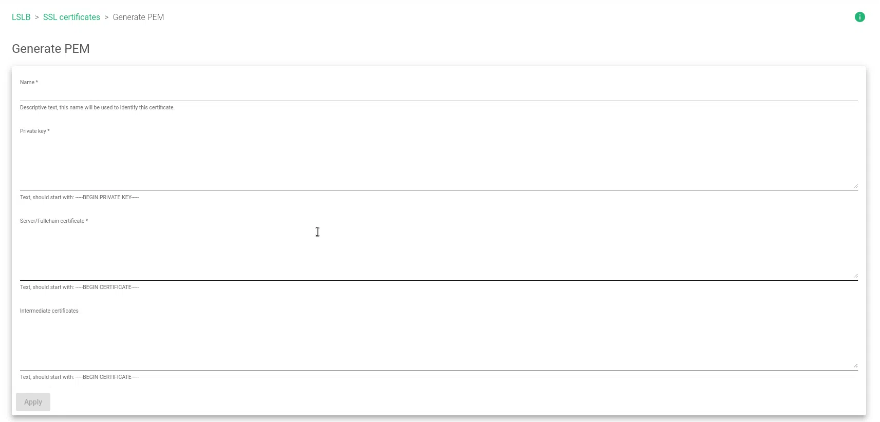 Once these segments are stored, and the Apply button is activated, the system initiates an evaluation via the OpenSSL library. This assessment verifies the accuracy of the components furnished in the form and determines if the full chain certificate in PEM format can be effectively constructed. In instances where an anomaly is detected by the OpenSSL library, an informative error will be displayed, allowing the system administrator to address the concern.