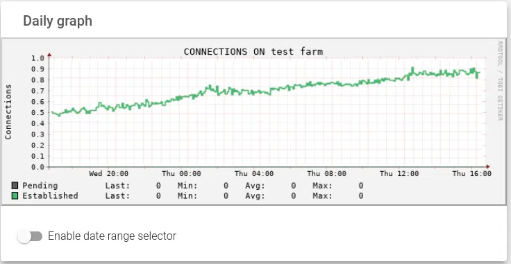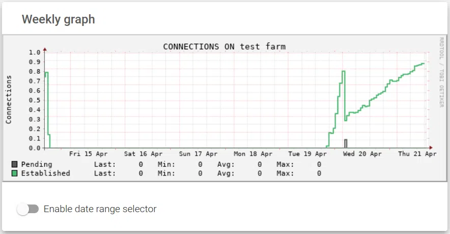 This section shows the monitoring graph history of established and pending connections of current farms in four various periods: last day, last week, last month and last year.