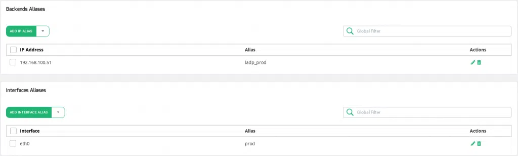 This section allows the management of backend aliases by assigning an IP address to the corresponding alias which could be used later in the farm’s backends.