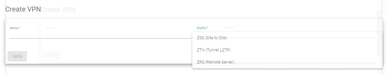 ZRS. This type is a ZEVENET Remote Site VPN. ZEVENET acts as a VPN server, so the clients could connect to such VPN and they will assign a dynamic IP address to be routed later on via the routing system. IPSEC implementation in server mode for clients in mode road warrior.