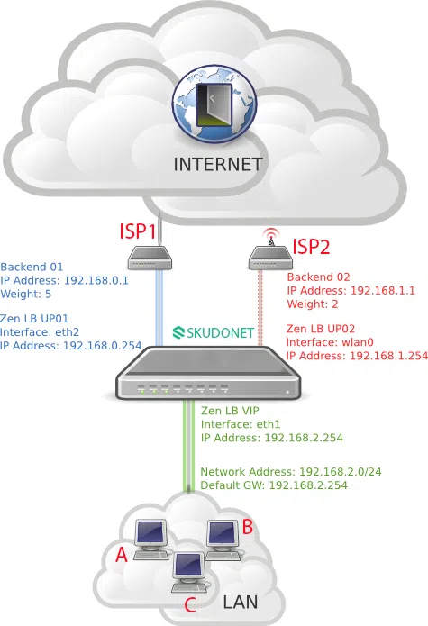 The diagram below shows an example of load balancing several uplinks with different weights: