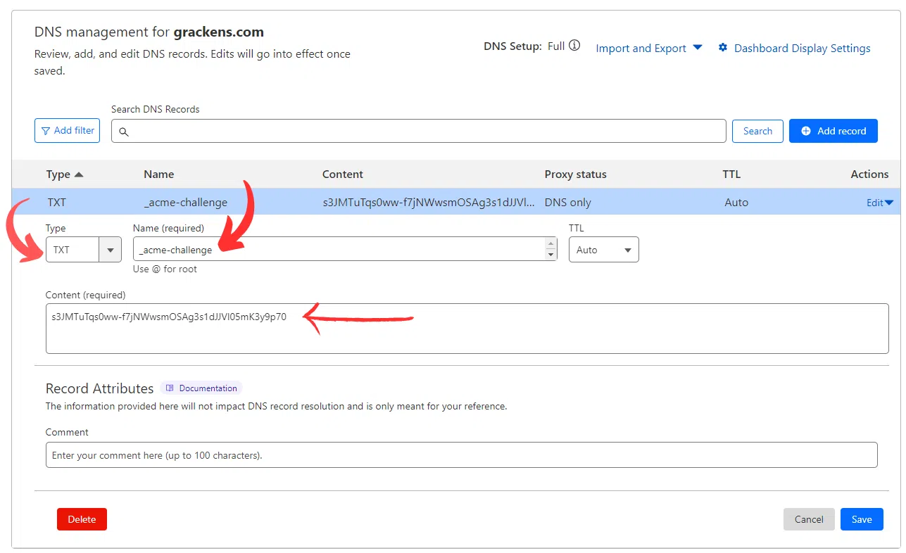 - After saving the TXT record on your DNS resolver, allow up to a maximum of 8 minutes for DNS propagation.
