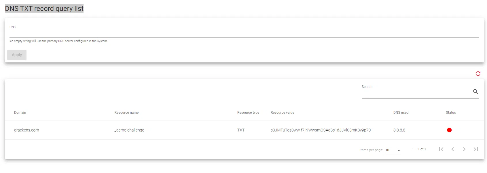 - To view the TXT record, hover over the domain whose TLS/SSL cert you’d like to generate and click the Eye Icon labeled Check DNS TXT Records, you will see a DNS TXT record query list.