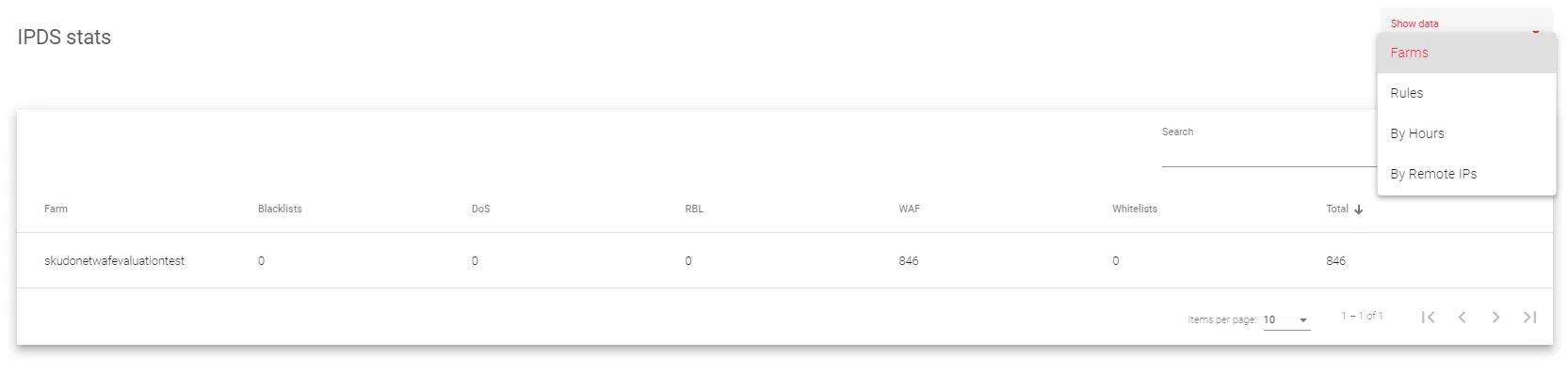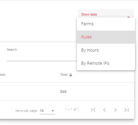 Users can categorize the monitored data by Farms, Rules, By Hours, or by the remote IPs. The following image displays the accessible statistics monitored within a specific Farm.