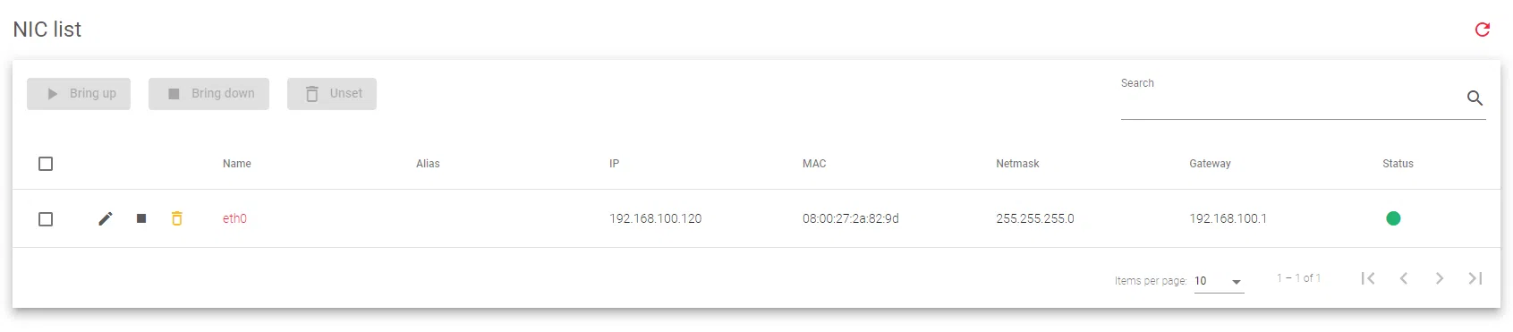 Actions: Available actions for the NIC, such as Edit, Bring up, Bring down, and Unset.