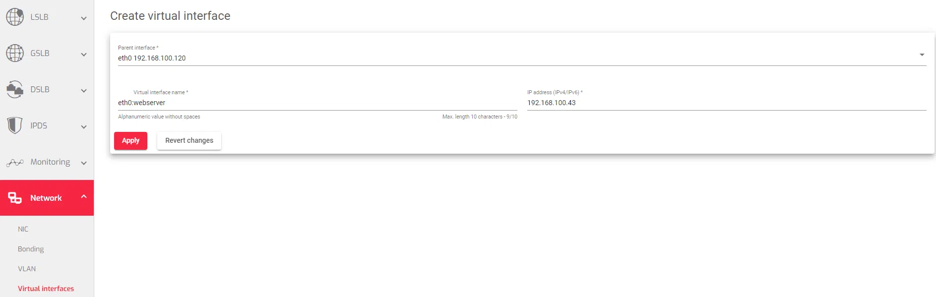 - IP address: Enter the IP address that you want to assign to the virtual interface. The IP address must be on the same network as the parent interface.