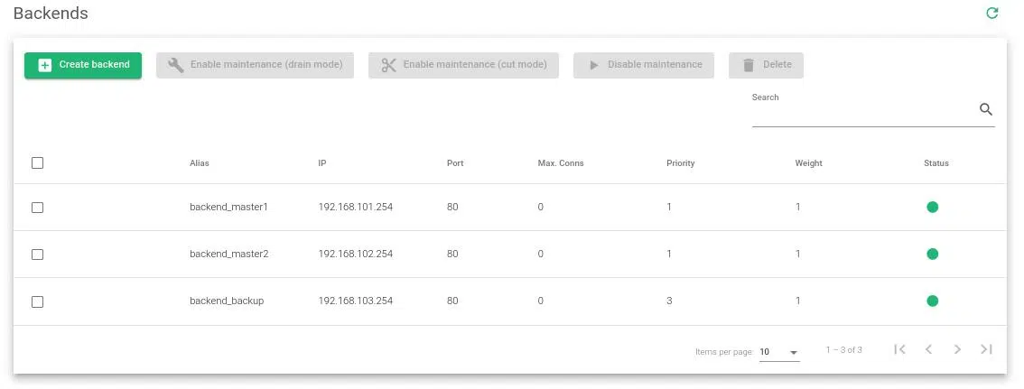 Automatically the backend_backup ( in third position ) becomes in down state ( even with the check_tcp is OK ) due to the priority assigned in the farmguardian command (“;priority 1 1 3”).