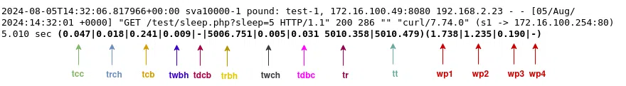2024-08-05T14:32:06.817966+00:00 sva10000-1 pound: test-1, 172.16.100.49:8080 192.168.2.23 - - [05/Aug/2024:14:32:01 +0000] "GET /test/sleep.php?sleep=5 HTTP/1.1" 200 286 "" "curl/7.74.0" (s1 -> 172.16.100.254:80) 5.010 sec (0.047|0.018|0.241|0.009|-|5006.751|0.005|0.031 5010.358|5010.479)(1.738|1.235|0.190|-)