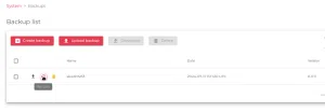 - Click on “upload backup”, enter a descriptive name for the file, and upload the already created file named backup-skudo1v63.tar.gz that is currently in your local system. A new file will be listed in the backups view as shown below.