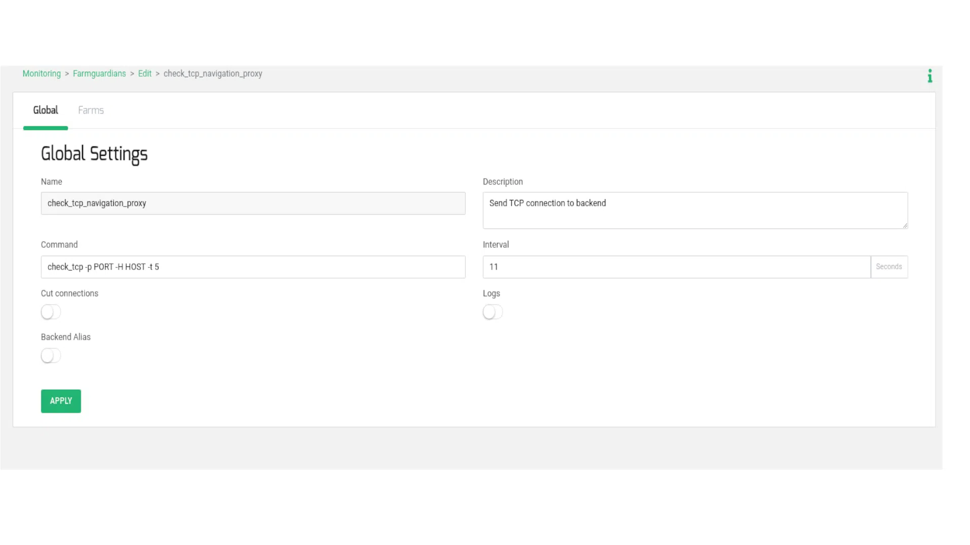 Navigate to the MONITORING > Farm guardian section. Generate a new farmguardian labeled check_tcp_navigation_proxy, duplicating the settings from check_tcp. Apply minor adjustments to the timeouts, as demonstrated below:
