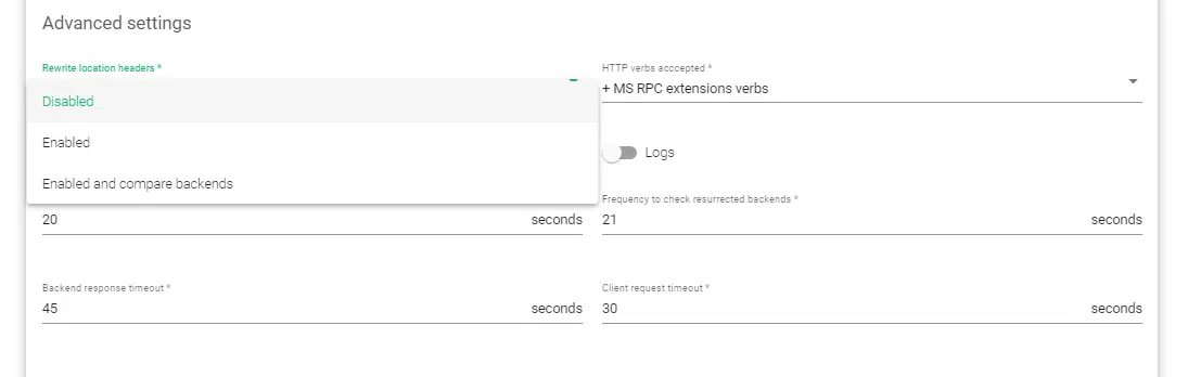 3. Within the Advanced settings, Select the Enable option within the rewrite location headers rule.