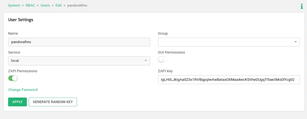 Once the user is created, ensure that the flag API Permissions is enabled and generate a API KEY, you can use the button GENERATE RANDOM KEY. Copy this value to be used in the Pandora FMS configuration plugin for SKUDONET ADC.